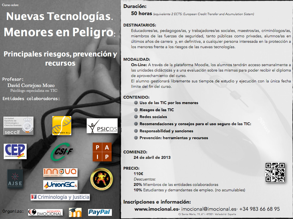 Nuestros amigos de Imocional informan de la realización de dos cursos on-line, uno sobre RIESGOS DE LAS TIC y el otro sobre INVESTIGACION CRIMINAL