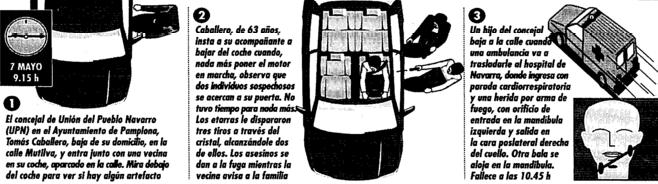 El Concejal de Pamplona por la UPN, partido asociado al PP, en el Ayuntamiento de Pamplona fue vilmente asesinado en el dia de hoy por asesinos de ETA, de dos tiros en la cabeza. El atentado tuvo lugar sobre las 09,30 horas en la calle Montilva, junto al domicilio de concejal, cuando este se hallaba dentro de su vehiculo para acudir a trabajar. Cuando dos asesinos se acercaron a la ventanilla de su vehiculo y dispararon contra el tres tiros practicaente a bocajarro.