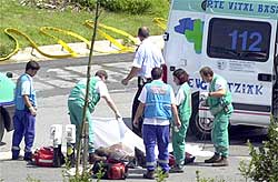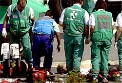 En las fotografias de arriba puede verse el momento en que los servicios hospitalarios se llevan a José Maria, asi como el estado en que quedó su coche y la desesperación de los empleados de la fabrica. Sin duda ETA considerara que ha hecho un «gran bien» al pueblo vasco con este asesinato.